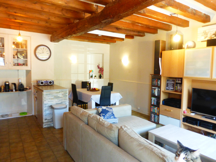 Centre historique de Houdan, vaste appartement en triplex / maison de ville avec place de parking et garage pour motos ou vélos, offrant belle cuisine aménagée et équipée, salon sous...